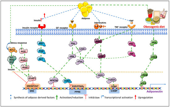 Peroxisome proliferator-activated receptor gamma is an important transcription factor belonging to the PPAR family, is a positive regulator of adiponectin transcription, and is widely expressed in adipose tissue. Lower adiponectin levels have been associated with the P12A mutation in PPARγ. The Thiazolidinedione class of medications (TZDs) are PPARγ agonists that stimulate adiponectin production and are used as antidiabetics. Its efficacy has been shown in vitro as well as in vivo studies [19,20,21] but could be limited by a mutation at a putative PPARγ-recognizing PPAR response element (PPRE) site [19]. However, some reports demonstrate an increase in high molecular weight (HMW) adiponectin biosynthesis in response to TZDs without changing adiponectin mRNA levels indicating a predominantly translational regulation of adiponectin synthesis. Forkhead box protein O1 (FoxO1) is another key regulator of adipocyte differentiation which is known to positively regulate adiponectin transcription [22]. Biological functions and cellular localization of this transcription factor is regulated by NAD-dependent deacetylase Sirt1 (sirtuin 1) and by additional post-translational modifications including phosphorylation and acetylation. It complexes with CCAAT-enhancer-binding proteins (C/EBPα) which in turn is stimulated by Sirt1 overexpression, consequently, activating adiponectin promoter [23]. However, FoxO1 activity could be controlled by multiple upstream events that can in turn regulate adiponectin levels. C/EBPα interacts with the CCAAT motif of the adiponectin promoter recruiting co-activators, in turn stimulating transcriptional activity. Co-expression of PPARγ and C/EBPα are known to significantly increase adiponectin expression [24,25]. Sterol regulatory element-binding proteins (SERBPs) are membrane-bound precursors that interact with the nuclear envelope or ER (endoplasmic reticulum) membranes. Sterol regulatory element-binding proteins regulate the transcription of lipid-metabolizing enzymes. Binding of SREBP to the SERBP response element (SRE) on adiponectin promoter amplifies adiponectin expression. Adiponectin promoter is also transactivated by SREBP-1c and is prevented in case there is a mutation in the SRE motif. Adenovirus-mediated overexpression of SREBP-1c is known to elevate adiponectin levels in 3T3-L1 adipocytes [26].