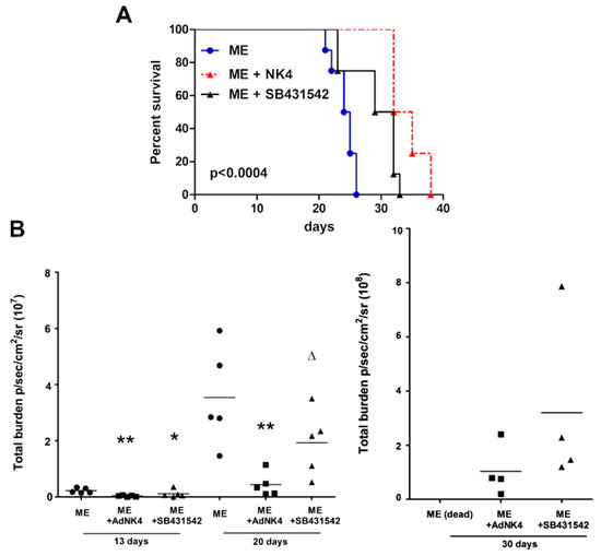 Figure 1 reports survival data of experiments performed with NK4, expressed by an adenoviral vector (AdNK4), or with SB431542. NK4 prevents HGF binding to Met receptor and blocks HGF signaling; SB431542 inhibits the signaling pathway(s) downstream of TGFβ1-RI [18,29]. The Kaplan–Meier analysis showed that the blockade of the HGF/Met axis or TGFβ1 signaling prolonged mouse survival (Figure 1A). Mice exhibiting bone metastasis (indicated as ME) died within 22–26 days from the 1833/TGL cell injection, while mice treated with SB431542 and AdNK4 survived until 33 and 38 days, respectively. All the comparisons were made versus the ME group since the xenograft mice injected with the control adenoviral vector AdLacZ survived as ME [25]. The survival was more prolonged under NK4 than under SB431542.