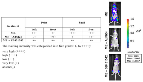 Semiquantitative evaluation of Twist and Snail expression. The expression of Twist and Snail was evaluated by immunohistochemistry on bone slides from 3 mice per group, i.e., ME at 25 days, and ME treated with AdNK4 or SB431542 at 32 days; the degree of positivity of the signals was shown as staining intensity. We report the bioluminescence images of representative mice from each of the three groups of treatments.