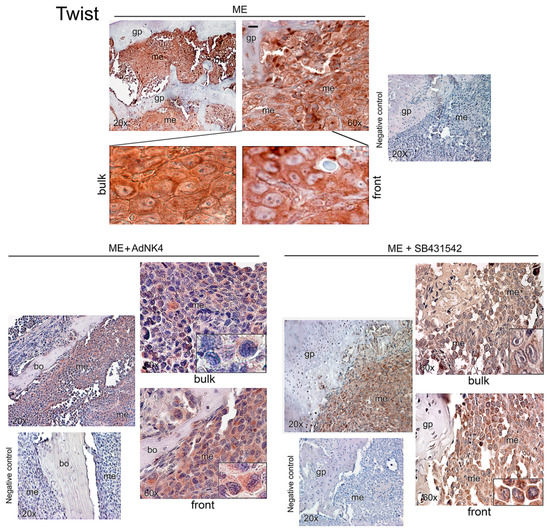 Effect of in vivo blockade of HGF or TGFβ1 signaling on Twist expression and localization in bone metastasis of the xenograft mice. Three animals were sacrificed at 25 days for ME, and at 32 days for ME+AdNK4 and ME+SB431542, and we show representative images for Twist immunostaining using bone slides of mouse 1; magnifications of details are reported in the insets. gp, growth plate; me, metastasis; bo, bone. Negative controls were performed without the specific antibody. Scale bar = 120 μm (reported in an exemplificative panel).