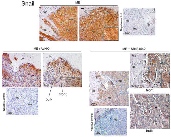 Effect of in vivo blockade of HGF or TGFβ1 signaling on Snail expression in bone metastasis of the xenograft mice. Three animals were sacrificed at 25 days for ME, and at 32 days for ME+AdNK4 and ME+SB431542, and we show representative images for Snail immunostaining using bone slides of mouse 1; magnifications of details are reported in the insets. gp, growth plate; me, metastasis; bo, bone. Negative controls were performed without the specific antibody. Scale bar = 120 μm (reported in an exemplificative panel).