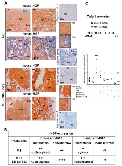 Enhancement of HGF expression in bone metastasis by SB431542: role played by HGF in Twist transactivation and interference of β-catenin. (A) Three animals were sacrificed at 25 days for ME, and at 32 days for ME+SB431542, and we show representative images for HGF immunostaining of bone slides from mouse 1, using anti-mouse and anti-human antibodies for HGF; magnifications of details are reported in the insets. gp, growth plate; me, metastasis; bm, bone marrow; mk, megakaryocytes; bo, bone. Negative controls were performed without the specific antibody. Scale bar = 120 μm. (B) In the table we report the semiquantitative evaluation of the degree of positivity of HGF signals at nuclear and cytosol levels for metastasis and bone marrow: the staining intensity with the two antibodies is shown. (C) Snail and TCF binding sites in Twist1 promoter are reported. The Twist1 gene reporter was transfected in 1833 cells, and Snail-expression vector co-transfection or HGF treatment was performed. Cells treated or not with HGF were transfected with various β-catenin expression vectors. The data of dot blots show the replicates: starvation (n = 6), HGF (n = 4), β-catenin expression vectors ± HGF and Snail expression vector (n = 3). * P < 0.05, *** P < 0.001 versus basal TwistLuc activity; Δ P < 0.05, ΔΔ P < 0.005 versus HGF-treated cells.