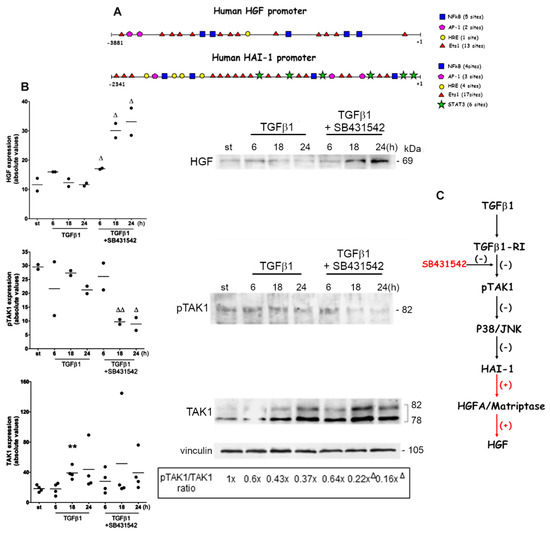 Effect of TGFβ1 exposure under TGFβ1-RI blockade on HGF formation. (A) Transcription factor binding sites in human HGF and HAI-1 promoters are reported. (B) Representative images of Western blots are shown; vinculin was used for normalization. The dot blots report the data of the Western blot experiments, which have been repeated two times for HGF and phosphoTAK1 immunoblotting, and four times for TAK1 immunoblotting. The pTAK1/TAK1 ratio was reported as fold-variations, that were calculated versus the starvation value. ** P < 0.005 versus the starvation value; Δ P < 0.05, ΔΔ P < 0.005 versus TGFβ1-treated cells at the corresponding time. (C) Schematic representation of the pathway leading to HGF formation under SB431542 treatment of TGFβ1-exposed 1833 cells. (−) Pathway inhibition; (+) pathway activation.