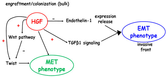 Bone metastases from breast carcinoma show a different phenotype at the invasive front (epithelial-mesenchymal transition, EMT) and in the bulk (mesenchymal-epithelial transition, MET), and the underlying molecular profiles regulated by HGF and TGFβ1 are schematized. (−) Pathway inhibition; (+) pathway activation.