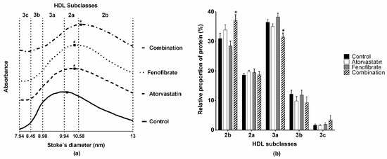 The atorvastatin and fenofibrate combination treatment increased the size of the high-density lipoprotein (HDL) particles. HDL were isolated by ultracentrifugation and separated in subclasses by non-denaturing 3%–30% polyacrylamide gel electrophoresis. The gels were stained for protein and were scanned to obtain the data to construct the graphs. (a) Graphs of HDL obtained from control, atorvastatin, fenofibrate, and combination rabbits. n = 6. Arbitrary absorbance units are plotted on the vertical axis. (b) The relative HDL size distribution estimated from graphs. The total area under the curve was considered as 100% and the partial areas between the intervals as relative percentages of HDL subclasses. Data are mean ± standard error. n = 6. * ANOVA test, p < 0.05 vs. control rabbits.