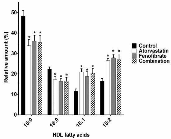 The relative amount of total HDL fatty acids shifted from saturated fatty acids towards unsaturated fatty acids with atorvastatin, fenofibrate, and the combination treatment. HDL were used to extract the lipids and the fatty acids composition was determined by gas chromatography–mass spectrometry. The fatty acids were identified by their retention time and mass spectrum; 16:0, palmitic acid; 18:0, stearic acid; 18:1, oleic acid; 18:2, linoleic acid. Data are mean ± standard error, n = 6. * ANOVA test, p < 0.05 vs. control rabbits.