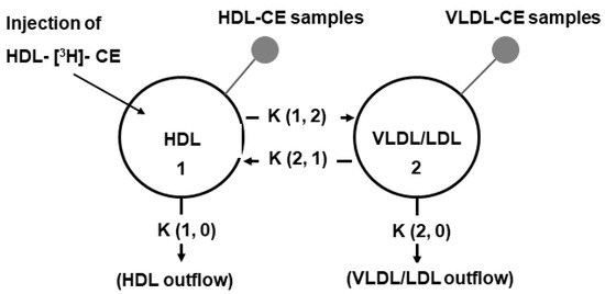 The radioactivity data were mathematically fitted to a two-compartment model. For the model (Figure 3), we considered two main plasma compartments; compartment 1 corresponding to the HDL fraction, whereas the VLDL/LDL fraction constituted compartment number 2. Additionally, four transfer coefficients were considered in the model (Figure 3); the transfer of CE from the HDL to VLDL/LDL (pro-atherogenic transfer) was represented by the transfer coefficient K (1, 2), the transfer of CE from the VLDL/LDL to HDL (anti-atherogenic transfer) was represented by the transfer coefficient K (2, 1) and the outflow of CE via HDL and VLDL/LDL were represented by the transfer coefficients K (1, 0) and K (2, 0), respectively. Modeling of the data was done with the SAAM II software (SAAM Institute, Seattle, WA, USA). The flow rates were calculated by multiplying the plasma concentration of CE by their corresponding transfer coefficient. The compartmental analysis was based upon a previous report [29].