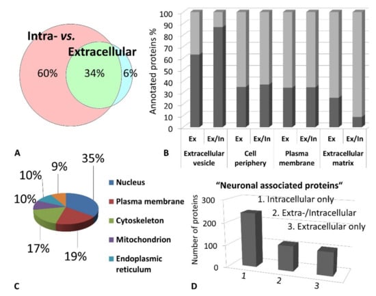 (A). The majority of identified proteins correspond to the intracellular fraction of the trabecular meshwork (TM) proteome inferred from gene ontology (GO) annotation analysis. (B) Exclusively extracellular proteins (Ex) as well as proteins with localization in the extra-and intracellular milieu (Ex/In) correspond predominantly to extracellular vesicles indicating secretory processes. (C) Most intracellular TM proteins correspond to the nucleus followed by the cellular plasma membrane. (D) The majority of “neuronal associated proteins” are intracellular protein species.
