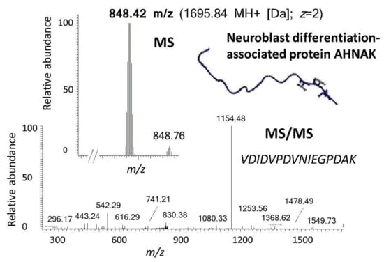 Exemplary identification of a prominent barrier function-related protein of neuronal relevance in the porcine trabecular meshwork (TM) by use of the established BULCMS workflow. A unique reporter peptide peak 848.42 m/z (MS) was fragmented by collision-induced decay (CID) (MS/MS) leading to the stringent identification of neuroblast differentiation-associated protein AHNAK (FDR < 1%) and was supported by both, database-related and de novo peptide sequencing analysis. (AHNAK image from the RCSB PDB (rcsb.org) of PDB ID 4FTG []).