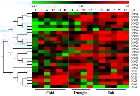 2.8. Expression Patterns of ClCDPK and ClCRK Genes under Abiotic Stresses