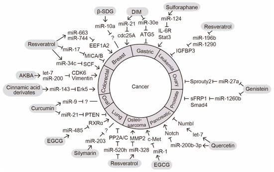 Understanding the anticancer function of phytochemicals mediated by miRNA regulation is currently an active area of research. As several miRNAs function as either oncogenic miRNAs or tumor suppressors [11], phytochemicals could exert their anticancer effects by directly controlling miRNA expression. In general, miR-21, miR-17, miR-30e, and miR-520h function as oncogenic miRNAs, whereas miR-200, miR-34c, miR-143, and let-7 function as tumor suppressors [11]. One phytochemical could regulate several oncogenic or tumor suppressive miRNAs in various cancers. For example, resveratrol controls miR-520h, miR-17, miR-328, miR-196b, miR-1290, miR-34c, miR-663, and miR-744 in leukemia, osteosarcoma, lung, prostate, breast, and colorectal cancers [13,21,23,24,25,26]. On the other hand, a typical oncogenic or tumor suppressive miRNA may be modulated by multiple phytochemicals, as in the case of miR-200, whose expression is regulated by at least two phytochemicals, AKBA and quercetin [64].