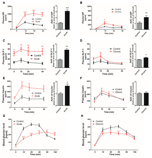 2.1. Incretin Secretion Increased by Glucose Gavage in Gastrointestinal (GI)-Inflamed Mice