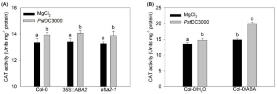 The alleviation of ROS-induced oxidative damage is often balanced via an efficient antioxidant defense system; for example, catalase (CAT) reacts with H2O2 to form oxygen and water [26]. We further detected whether CAT is differentially regulated by endogenous and exogenous ABA under PstDC3000 infection. The results showed that CAT activity was not different between wild-type, 35S::ABA2, and aba2-1 plants (Figure 3A). However, ABA treatment significantly enhanced CAT activity in wild-type plants under PstDC3000 infection (Figure 3B).