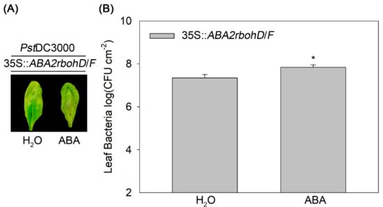 In Arabidopsis, the nicotinamide adenine dinucleotide phosphate (NADPH) oxidases, such as RBOHD and RBOHF, are mostly responsible for ROS generation during plant–pathogen interactions [25]. We examined whether endogenous and exogenous ABA differently regulate RBOHD and RBOHF transcripts in Arabidopsis under PstDC3000 infection. Compared to wild-type, 35S::ABA2 plants displayed an increase in the transcript levels of RBOHD and RBOHF (Figure S1). In contrast, aba2-1 showed a reduced level of expression of these two genes under PstDC3000 infection (Figure S1). ABA treatment also enhanced the expression of RBOHD and RBOHF, compared to water treatment (Figure S2). These results indicate that both endogenous and exogenous ABA upregulate RBOHD and RBOHF expression in Arabidopsis under PstDC3000 infection.