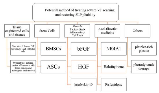 Over the last 10 years, Hirano et al. have been working with various growth factors to develop tissue engineering tools that can be used in regenerative medicine. Among these, basic fibroblast growth factor (bFGF) [9] and HGF [59,102,103,104,105] have shown some potential in restoring VF scars.