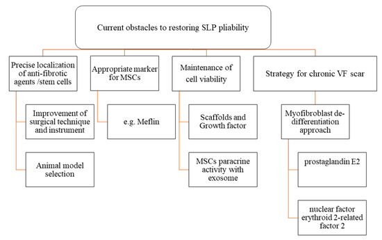 Overall, various promising and encouraging strategies for restoring the pliability of the VF scar are currently being developed, however, are mid-way as is the situation so far. Despite basic and clinical otolaryngological research to develop novel treatments, VF scarring remains difficult to resolve for two major reasons. First, to restore pliability, antifibrotic agents or cells must be precisely targeted to, and remain viable in, the SLP. In this regard, amelioration of VF scarring via the paracrine paradigm using MSCs needs to be investigated further. Second, a basic strategy for regenerating chronic VF scars is needed. In addition to preventing scar maturation, potential methods for transforming chronic VF scar tissue into normal pliable VF tissue need to be investigated.