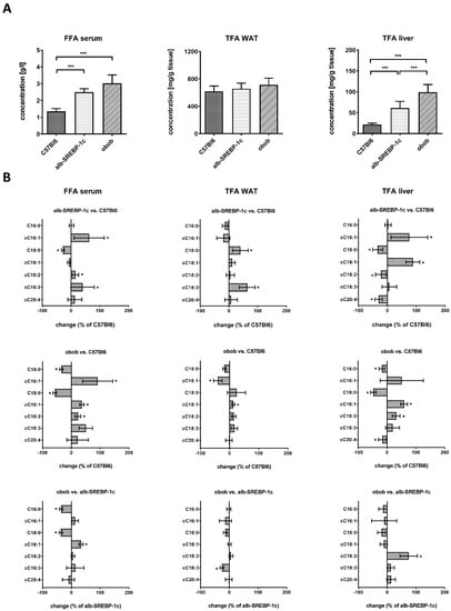 Lipid compositions of the C57Bl6, alb-SREBP-1c, and obob mice. (A) Total and specific fractional composition of the serum free fatty acids (FFAs) and the liver or adipose tissue total fatty acids (TFAs); (B) the percentage changes in the serum FFA and the liver or adipose tissue TFAs in alb-SREBP-1c vs. C57Bl6, obob vs. C57Bl6, and obob vs. alb-SREBP-1c. Data are expressed as mean ± SD (n = 8 of each phenotype). * p < 0.05, ** p < 0.01, and *** p < 0.001, by one-way ANOVA, with a Sidak post-hoc test (A) or students’ t-test (B).