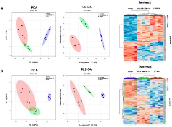 Classification of the mouse models according to the identified differential adipokinomes: (A) classically or non-classically secreted (SP+/SP−) proteins and (B) NP proteins. Principal component analyses (PCA), partial least square discriminant analyses (PLS-DA), and a heat map of the top 100 proteins with the greatest difference (ANOVA).