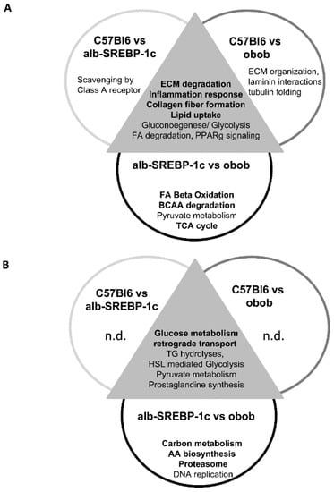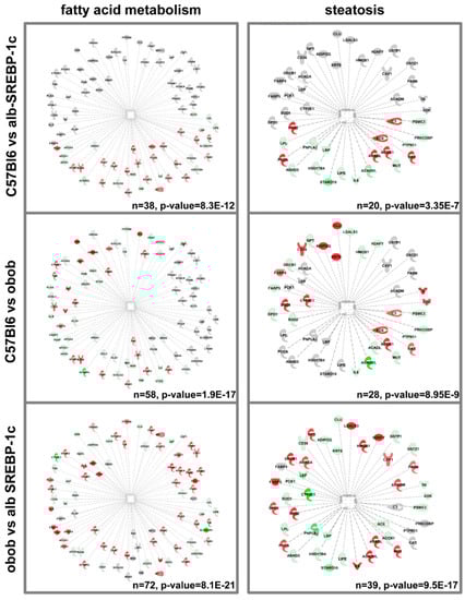 To determine more informative interactions of the different adipokinomes, we used integrative annotation to extend the information to the suggested up- or downstream interactions of the identified proteins. Within these analyses, the most prominent functional overlap was the differential protein patterns per genotype, set to fatty acid metabolism or proteins initially identified to be related to steatosis (Figure 5). There was a differential overlap with fatty acid metabolism in the protein sets of C57Bl6 vs. alb-SREBP-1c (n = 38, p-value = 8.3 × 10−12), C57Bl6 vs. obob (n = 58, p-value = 1.9 × 10−17), and C57Bl6 vs. alb-SREBP-1c (n = 72, p-value = 8.1 × 10−21) (Figure 5). In addition, the number and significance of the proteins related to steatosis processes gradually increased with the severity of obesity in the comparisons of C57Bl6 vs. alb-SREBP-1c (n = 20, p-value 3.35 × 10−7), C57Bl6 vs. obob (n = 28, p-value 8.9 × 10−9), and obob vs. alb-SREBP-1c (n = 39, p-value 9.5 × 10−17) (Figure 5).