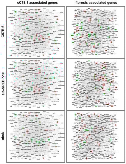 Differential abundance of FA metabolism and steatosis-related proteins in adipokines correlated to the “liver-to-adipose-tissue DNL” ratio. Virtual pathways were generated from proteins related to the keywords to cC18:1 or fibrosis. The proteins that correlated with the “liver-to-adipose-tissue DNL” ratio were used for IPA® core analyses to extend the information to upstream regulating proteins (Supplementary Materials Table S6). Coloring represents the different abundances in the comparisons of C57Bl6 vs. alb-SREBP-1c, C57Bl6 vs. obob, and alb-SREBP-1c vs. obob. (Red: more abundant; green: less abundant; grey: not regulated in the specific comparison).