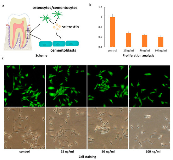 (a) Schematic illustration of the effect on cementoblasts through use of sclerostin secreted by osteocytes; (b) Proliferation analysis of cementoblasts in the presence of sclerostin; (c) Live-cell staining treated by sclerostin with different concentrations.