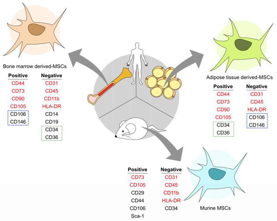 Mesenchymal stem cells/multipotent stromal cells (MSCs) are a subset of non-hematopoietic adult stem cells found in various tissues in the body [12,16]. They serve as the resident tissue sources for precursor cells to aid in tissue replacement and repair via differentiation and ability to modulate the surrounding microenvironment through secretion of trophic factors [17,18,19]. They are characterized by their ability to adhere to plastic, self-renew, and differentiation potency into adipogenic, chondrogenic, and osteogenic cell types [20,21]. Human MSCs are commonly characterized by the expression, or lack thereof, of cell surface markers as CD73(+), CD90(+), CD105(+), CD106(+), CD44(+), CD45(−), CD31(−), CD34(−), and HLA-DR(−) [21,22,23]. However, MSCs are a heterogeneous lot both in terms of tissue of origin and within population; single cell sequencing and advances in multiparametric flow cytometry are defining further subpopulations. Moreover, the original locations must be taken in consideration when isolating MSCs. For example, bone marrow-derived MSCs (BM-MSCs) have positive biomarkers CD73, CD90, CD105, CD106, CD44, CD10, CD13, CD140β, CD146, and CD271 [24,25] but need to be lacking hematopoietic lineage markers such as CD45, CD34, CD14 or CD11b, CD79α or CD19, and HLA-DR, to distinguish from hematopoietic stem cells [21]. LNGFR and integrin alpha-1 have also been used to purify a relatively homogeneous population of MSCs from bone marrow. Murine BM-MSCs also share CD73(+), CD105(+), CD106(+), CD44(+), CD45(−), CD31(−), CD34(−), CD45(−), CD34(−), and CD11b(−) markers with humans, but also express Sca-1(+) and CD29 (+) as well [26,27]. In addition, other MSC tissue populations such as adipose-derived MSCs maintain the CD73(+), CD90(+), CD105(+), CD106(+), CD44(+), CD45(−), and CD31(−) expression phenotype; but are distinct from BM-MSCs by expressing the additional markers CD36(+), CD34(+), CD106(−), and CD146(−) [28,29,30], as shown in Figure 1.