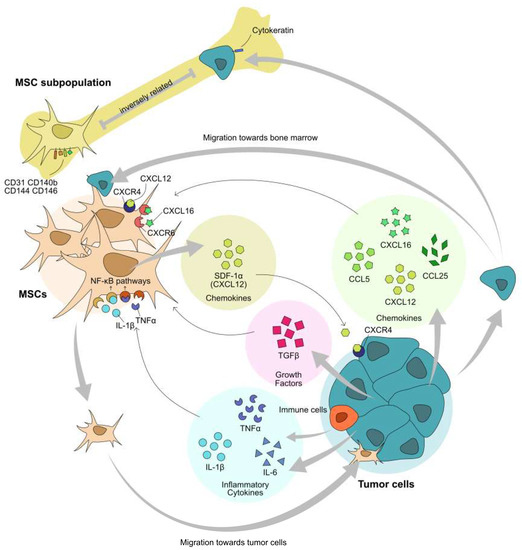 MSCs are the key players in tumor progression [31]. It has been found that MSCs derived from various tissues can home to tumor sites. Tumor cells and MSCs are able to migrate into each other’s niches, as shown in Figure 2. BM-MSCs contribute to the tumor stromal construction by differentiating into endothelial cells or myofibroblasts within and mostly surrounding the tumors in transgenic mouse models of dissemination [32,33]. Accumulating evidence suggests that MSCs can be attracted to tumor sites through multiple signals, including inflammatory cytokines, chemokines, and growth factors [34]. Those signal molecules can be generated by tumor cells themselves or by other cells in TME, and inflammatory cells in particular [35]. Inflammatory cytokines, for example, interleukin-1 beta (IL-1β) and tumor necrosis factor alpha (TNF-α) secreted by immune cells could be acting as chemoattractants for MSCs chemotaxis to tumor sites [36,37]. IL-6 is highly secreted by tumor cells under hypoxic conditions and serves to attract and activate MSCs [38]. Growth factors, such as transforming growth factor-beta (TGF-β), could also induce migration of BM-MSCs [39]. Chemokine CCL25 released by multiple myeloma cells attracts BM-MSCs’ move to the tumor location. CCL5 and CXCL12 also play important roles in MSCs’ migration to the osteosarcoma cell line Saos-2 [40]. CXCL16 is a ligand of CXCR6, and it is proved to be involved in the migration of MSCs towards prostate cancer [41].