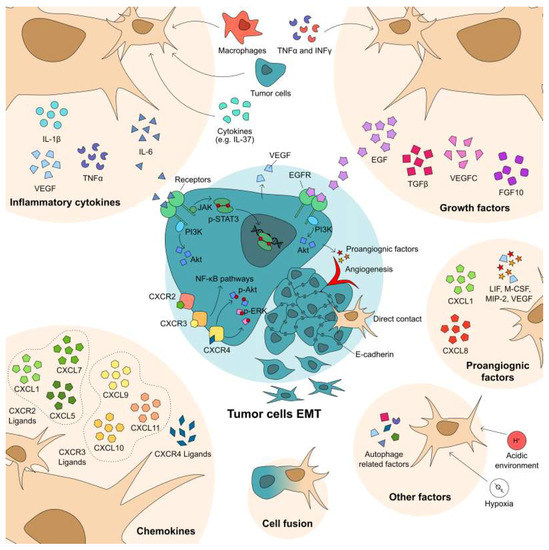 Several cytokines including IL-6, IL-8, IL-10, and VEGF have been found to be secreted at higher levels by MSCs activated by IL-37, macrophages, or tumor cells [47,58,59,60]. Within the tumor microenvironment, IL-6 signaling is generally considered a malevolent player, promoting tumor progression [61]. IL-6 was firstly found mediating the communications between osteosarcoma cell line Saos-2 and MSCs; a manner in which proliferation was promoted by each other’s conditioned media [47]. MSCs isolated from colorectal tumors (CC-MSCs) secreted very high levels of IL-6 in vitro. With the presence of conditioned media from CC-MSCs, colorectal cancer cell lines SW48 and SW480 underwent cEMT, concomitant with enhanced cell migration, invasion, and proliferation [62]. Co-injecting CC-MSCs and SW48 cells in a murine xenograft model enhanced the tumor growth and lung metastasis. IL-6 in the CC-MSC-conditioned media activated Stat3 through Jak2, and PI3K-Akt signaling pathways [62], that latter also being a pathway that promotes tumor cell survival [6]. Macrophages, a major cell component in TME, are able to active MSCs with increased IL-6 and CXCL10 secretion as well [58,63].