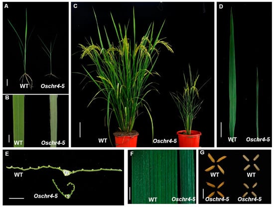 A rice mutant characterized by narrow and rolled leaves was isolated from the gamma ray mutagenized Indica rice cultivar Indica 9, which was named as Oschr4-5 based on the gene identity revealed in the following study. At the seedling stage, slight dwarfism and albino on the adaxial side of leaves were observed in Oschr4-5 (Figure 1A,B). At the mature stage, the plant height and tiller number of Oschr4-5 was significantly reduced by 45% and 76% when compared with that of WT (p < 0.01) (Figure 1C, Table S1). The length and width of the leaves in Oschr4-5 was significantly reduced by 38% and 50% when compared with that of the WT (p < 0.01) (Figure 1D,F, Table S1). Meanwhile, smaller seeds were also observed in Oschr4-5 (Figure 1G). Later on, two allelic mutants, namely Oschr4-6 andOschr4-7, were isolated from the Ethyl methane sulfonate (EMS) mutagenized japonica cultivar Nipponbare, which exhibited the same pleiotropic phenotypes, including narrow and rolled leaves with albino on the adaxial side, significantly reduced leaf length, plant height, tiller number and seed size (Figure S1, Table S1).