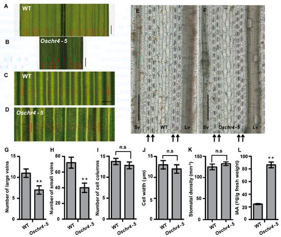 To reveal the underlying cellular basis of narrow leaves in the Oschr4-5 mutant, the venation pattern of leaf was first observed. The number of large veins and small veins of Oschr4-5 was significantly reduced by 36% and 42%, respectively, of that of the WT (p < 0.01) (Figure 2A–D,G–H). Then the epidermal cell profile on the abaxial side of leaf blade was examined. Neither the number of cell column between the adjacent small vein nor the cell width at the horizontal orientation showed significant difference between Oschr4-5 and WT (Figure 2E,F,I,J). These results indicate that the decreased leaf width in Oschr4-5 may be caused by reduction in the number of veins. Since auxin is required for specification of the venation pattern in leaves [,] and auxin overproduction usually leads to narrow and epinastic leaves in Arabidopsis [,], the amount of free indole acetic acid (IAA), the major auxin, in Oschr4-5 and WT was measured. As a result, the content of IAA in Oschr4-5 was significantly higher than that of WT (86.39 ± 4.55 vs. 24.39 ± 0.76 ng/g, p < 0.01) (Figure 2L).