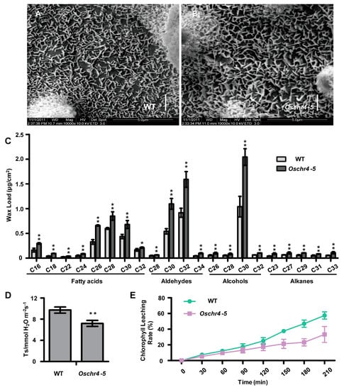 Scanning electron microscopy was used to examine the surface of leaves. Interestingly, the platelet-like wax crystals deposited on the leaves’ surface were larger and denser in Oschr4-5 compared with WT (Figure 3A,B). Then the compositions and contents of cuticular wax were measured by gas chromatography-mass spectrometry (GC-MS). As shown in Figure 3C, the wax components of fatty acids, aldehydes, alcohols and alkanes were all significantly increased in Oschr4-5 than WT (p < 0.05).