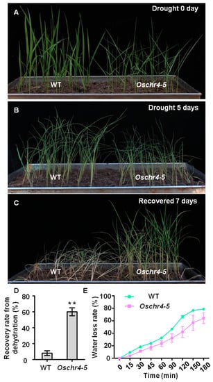 As the content and structure of cuticular wax could strongly influence cuticle permeability, its effects on transpiration rate were first evaluated. Indeed, the transpiration rate of Oschr4-5 was significantly lower than that of WT (p < 0.01) (Figure 3D). Secondly, measurement of cuticle membrane permeability as demonstrated by chlorophyll-leaching rate showed that chlorophyll leaches slower from Oschr4-5 than WT at different time points (Figure 3E). Furthermore, a dehydration-rehydartion treatment revealed that drought tolerance of Oschr4-5 was significantly enhanced. The Oschr4-5 seedlings showed significantly higher recovery rate than WT (60% vs. 8%, p < 0.01) (Figure 4A–D). The water loss rate was also measured to evaluate the water retention capacity of detached leaves. The data showed that water loss rates of Oschr4-5 were significantly slower than in WT (Figure 4E). The possible effects of stomatal density and leaf thickness on the differential water loss rate might be ruled out because no significant difference was detected in the stomatal density (Figure 2E,F,K) and leaf blade thickness (WT: 107.43 ± 7.51 μm; Oschr4-5: 108.17 ± 7.23 μm) between Oschr4-5 and WT. These results prove that Oschr4-5 exhibited lower cuticle permeability and water loss because of higher cuticular wax content on the surface of leaves compared to WT.
