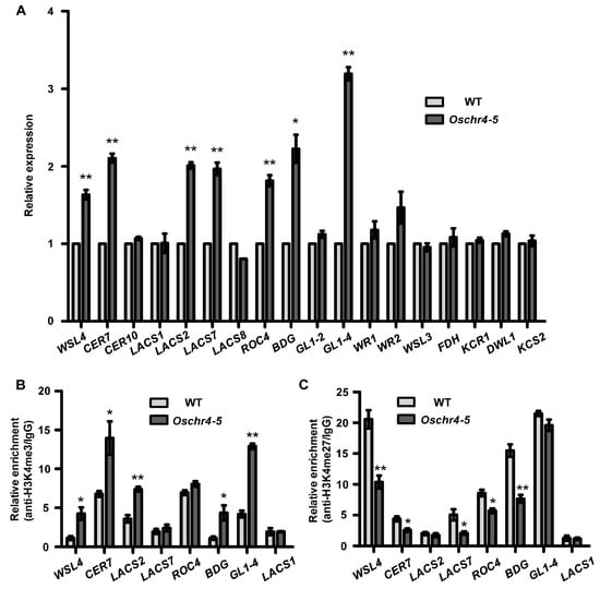 As a chromatin remodeling factor, the loss of OsCHR4 function was identified to influence the rice plant growth and development in various ways [,,,,], but the underlying molecular mechanisms need to be further analyzed. To understand why the content of cuticular wax increased in the Oschr4-5 mutant, we examined the expression levels of 16 genes encoding enzymes involved in wax biosynthesis and three genes (ROC4, WR1, WR2) encoding transcription factors that activate the expression of wax biosynthetic genes [,,,,]. Quantitative real-time polymerase chain reaction (RT-PCR) using RNA samples prepared from leaves of 30-day-old plants revealed that transcript levels of six wax biosynthetic genes (GL1-4, WSL4, OsCER7, LACS2, LACS7, BDG) and one transcription factor gene (ROC4) [,,,,] were significantly upregulated in Oschr4-5, compared with WT (Figure 6A). This result suggests that loss of function of CHR4 affects the expression of important genes involved in the wax biosynthesis.