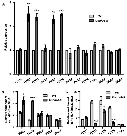 The YUCCA gene, which encodes a flavin monooxygenase-like enzyme, is known to be involved in Trp-dependent auxin biosynthesis []. The TAA/TAR genes, which encode putative Trp aminotransferases, have been proposed to act in the same pathway with YUCCA genes []. To explain the increased IAA level in the Oschr4-5 mutant, we measured the expression levels of 13 genes from the YUCCA and TAA/TAR family between three-day-old seedlings of WT and Oschr4-5. The transcript levels of four YUCCA related genes including YUC2, YUC3, YUC5 and YUC6 were upregulated significantly in the Oschr4-5 mutants (Figure 7A). However, the other 9 genes showed no significant alteration in the Oschr4-5 mutants. These results suggested that OsCHR4 may influence the expression of several wax-related and IAA-related genes, and the increased gene expressions in the Oschr4-5 mutants conduces to higher wax and IAA content in Oschr4-5 than WT.
