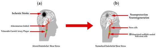 Stem cell therapy in ischemic stroke: (a) Vulnerable carotid artery plaque with altered endothelial shear stress (ESS) resulting in ischemic stroke; (b) 3D scaffold providing plaque stabilization, the correction of carotid stenosis and ESS with simultaneous neuroprotection and neuroregeneration at the level of the ischemic brain.