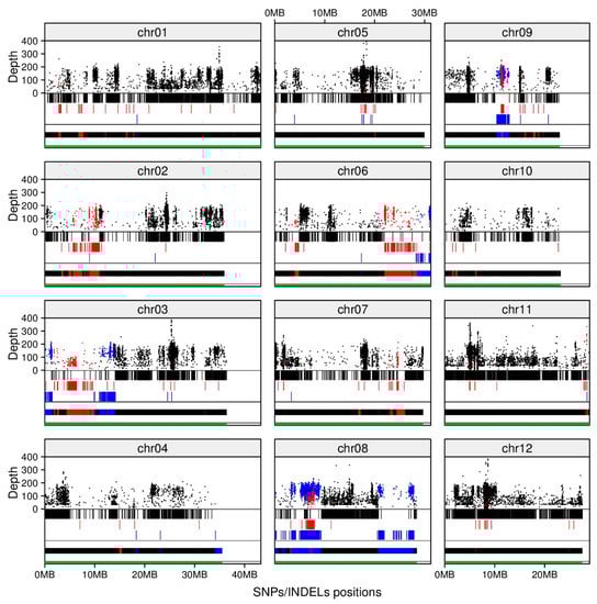 Positions and depths of SNPs/indels and genotype blocks on BC3F2 #31-2-4 genome. Dots show coverage depth of SNPs/indels. Vertical bars show their positions by genotype (color). Horizontal bar shows densities of SNPs/indels densities in 10,000-nt sliding window by genotype (colour). Black, “Yukinko-mai”-type homozygous; red, “Kaijin”-type homozygous; blue, heterozygous. Green bars represent chromosome length.