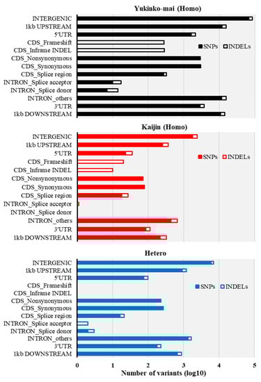Sequence Ontology analysis of BC3F2 SNPs/indels. Sequence Ontology is based on SnpEff terms with minor modifications. Closed bars, SNPs; open bars, indels. Black, “Yukinko-mai”-type homozygous, red, “Kaijin”-type homozygous; blue, heterozygous.