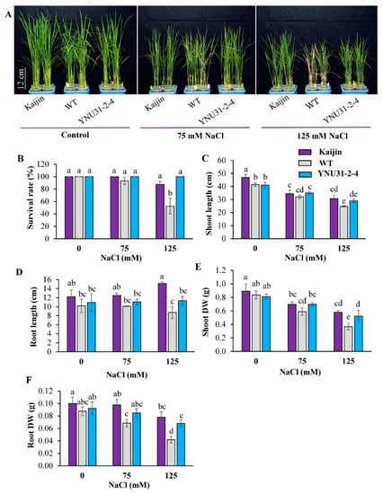 Salinity tolerance of BC3F3 line “YNU31-2-4” at seedling stage. (A) Phenotypic comparison of “Kaijin”, WT, and “YNU31-2-4” seedlings grown in 0, 75, or 125 mM NaCl for two weeks. (B) Survival rates, (C) shoot length, (D) root length, (E) shoot dry weight, and (F) root dry weight of seedlings shown in A. Data in B–F are mean ± SD of four independent biological replicates; data in E and F are dry weight (DW) of 10 plants in each treatment. Bars labeled with the same letter are not statistically different (Tukey’s test, p < 0.05).