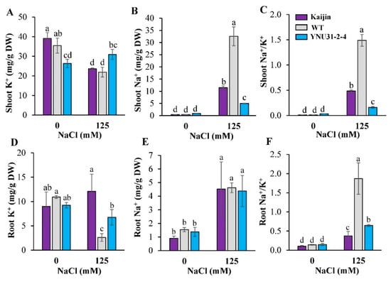 We assayed the K+ and Na+ contents in shoots and roots of seedlings under salinity, since the degree of stress depends on their uptake and translocation. Under control condition, shoot K+ was significantly lower in “YNU31-2-4” than in its parent (Figure 5A), whereas under salt stress, it was 1.4× the WT level in shoot and 2.6× in root (Figure 5A,D). Under control condition, Na+ levels in leaves (Figure 5B) and roots (Figure 5E) of all genotypes remained similarly low. Salinity stress increased Na+ concentration in WT shoots relative to the other two genotypes, reaching 6.5× that in “YNU31-2-4” plants (Figure 5B). Under control conditions, the Na+/K+ ratio did not differ significantly among the tested genotypes in shoots (Figure 5C) and roots (Figure 5F). Under salinity, it was 9.2× the “YNU31-2-4” level in WT shoots and 2.9× in WT roots (Figure 5C,F).
