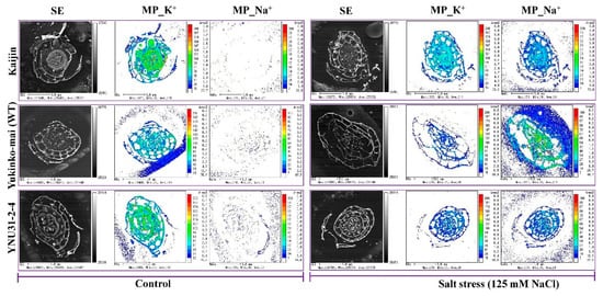 For localization of sodium and potassium ions, we prepared samples according to the protocol of Mitsui et al. [91]. Harvested basal portions of shoots were immediately frozen and embedded in OCT compound medium (Sakura Finetek USA, Inc., Torrance, CA, USA), which contained 10.24% w/w polyvinyl alcohol, 4.26% w/w polyethylene glycol, and 85.50% w/w of a nonreactive ingredient. Then 5-µm sections were scanned with an electron probe microanalyzer (EPMA-1605; Shimadzu, Kyoto, Japan).