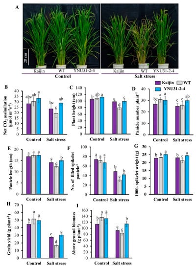 Under control condition at the reproductive stage, there was no obvious phenotypic difference between WT and “YNU31-2-4” plants (Figure 7A). Salt stress for five weeks caused severe burning and wilting symptoms in WT, but “YNU31-2-4” and “Kaijin” plants maintained green leaves. Under control condition, the penultimate leaves of “YNU31-2-4” plants maintained a slightly higher net CO2 assimilation rate than the parents (Figure 7B). Salt stress for four weeks significantly reduced the net CO2 assimilation rate of WT plants relative to “YNU31-2-4” and “Kaijin”. Under the control condition, WT and “YNU31-2-4” plants had similar phenotypic characters and yield attributes except for a higher 1000-spikelet weight than the parents (Figure 7C–G). Under salt stress, in contrast, “YNU31-2-4” had higher plant height, yield characters, and aboveground biomass than WT (Figure 7C–G,I). Relative to control condition, salt stress reduced grain yield by 68% in WT but by 38% in “YNU31-2-4” (Figure 7H). As a result, the grain yield of “YNU31-2-4” was 10% higher than that of the donor parent “Kaijin” under control condition and 45% higher than that of WT under saline condition.