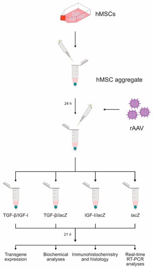 Study design. Human bone-marrow-derived mesenchymal stem cells (MSCs) were prepared in high-density aggregate cultures (2 × 105 cells/aggregate) and placed in defined chondrogenic medium overnight prior to direct transduction with the recombinant adeno-associated virus (rAAV) vectors (TGF-β/IGF-I, TGF-β/lacZ, IGF-I/lacZ: 40 µL each vector/aggregate; lacZ: 80 µL vector/aggregate). rAAV-transduced aggregates were maintained in the defined chondrogenic medium for 21 days and analyzed to detect transgene expression and for biochemical analyses, immunohistochemistry and histology, and real-time RT-PCR analyses.