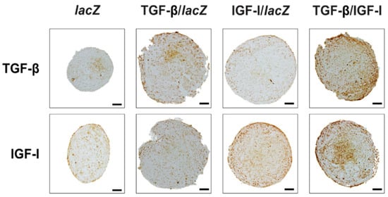 Overall, these results were corroborated by an evaluation of transgene expression over time (21 days) on histological stions from aggregates by immunohistochemistry (Figure 2 and Table 2). Immunoreactivity to TGF-β was more intense in the TGF-β/IGF-I versus lacZ, TGF-β/lacZ, and IGF-I/lacZ aggregates (3.4-, 1.1-, and 3.1-fold difference, respectively, p ≤ 0.030). It was also higher in the TGF-β/lacZ versus lacZ and IGF-I/lacZ aggregates (3.2- and 2.9-fold difference, p ≤ 0.020) while no difference was seen between the IGF-I/lacZ and lacZ aggregates (p = 0.500). Immunoreactivity to IGF-I was more intense in the TGF-β/IGF-I versus lacZ, TGF-β/lacZ, and IGF-I/lacZ aggregates (3.3-, 2.7-, and 1.1-fold difference, respectively, p ≤ 0.050). It was also higher in the IGF-I/lacZ versus lacZ and TGF-β/lacZ aggregates (3- and 2.5-fold difference, respectively, p ≤ 0.050) while no difference was seen between the TGF-β/lacZ and lacZ aggregates (p ≥ 0.050).