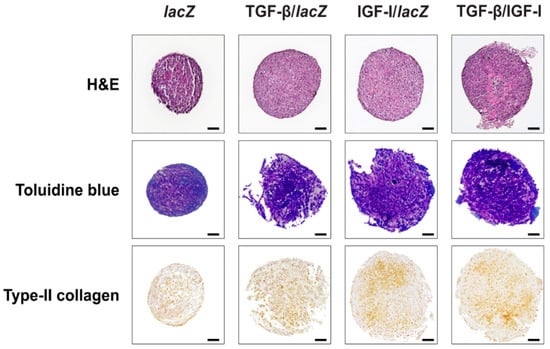 The chondrogenic differentiation and matrix synthetic activities assessed by monitoring the proteoglycan contents and the intensities of toluidine blue staining and of type-II collagen immunostaining were higher in the TGF-β/IGF-I versus lacZ, TGF-β/lacZ, and IGF-I/lacZ aggregates (proteoglycans: 3.3-, 1.3-, and 1.7-fold difference, respectively, p ≤ 0.030; toluidine blue: 1.6-, 1.1-, and 1.2-fold difference, p = 0.007, p = 0.196, and p = 0.030, respectively; type-II collagen: 2.9-, 1.3-, and 1.7-fold difference, respectively, p ≤ 0.013) (Table 2 and Table 3 and Figure 3). They were also higher in the TGF-β/lacZ versus lacZ and IGF-I/lacZ aggregates (proteoglycans: 2.7- and 1.3-fold difference respectively, p ≥ 0.050; toluidine blue: 1.5- and 1.2-fold difference, p = 0.008 and p = 0.091; type-II collagen: 2.3- and 1.3-fold difference, p ≤ 0.024) and in the IGF-I/lacZ versus lacZ aggregates (proteoglycans: 2-fold difference, p ≥ 0.050; toluidine blue: 1.3-fold difference, p = 0.108; type-II collagen: 1.7-fold difference, p ≤ 0.001).