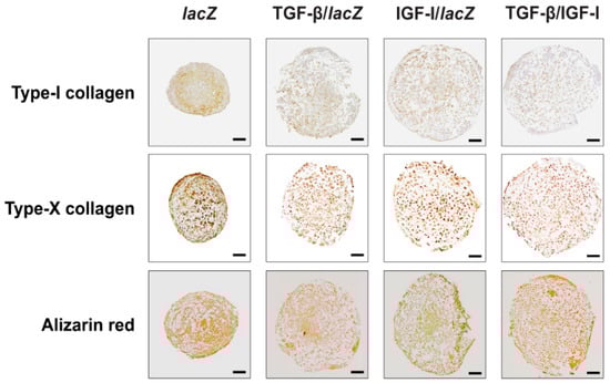 The osteogenic differentiation activities estimated by monitoring the intensities of type-I collagen immunostaining were lower in the TGF-β/IGF-I versus lacZ, TGF-β/lacZ, and IGF-I/lacZ aggregates (2-, 1.2-, and 1.5-fold difference, p ≤ 0.001, p = 0.308, and p = 0.048, respectively) (Figure 4 and Table 2). They were also lower in the TGF-β/lacZ versus lacZ and IGF-I/lacZ aggregates (1.7- and 1.3-fold difference, p = 0.005 and p = 0.112, respectively) and in the IGF-I/lacZ versus lacZ aggregates (1.3-fold difference, p = 0.005).