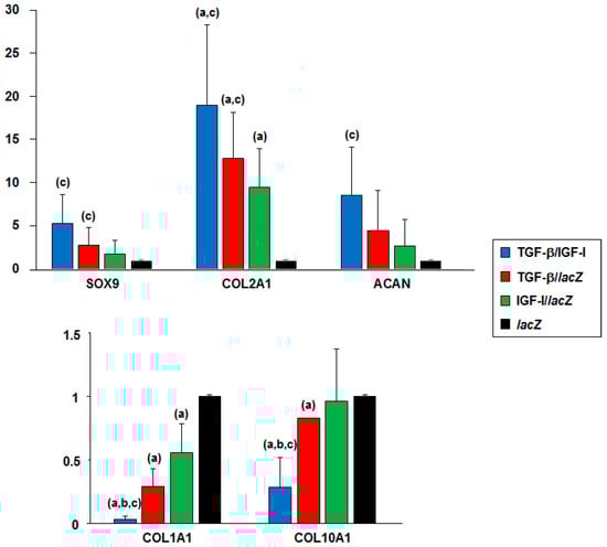 Enhanced chondrogenic differentiation was evidenced by increased SOX9 expression in the TGF-β/IGF-I versus lacZ, TGF-β/lacZ, and IGF-I/lacZ aggregates (5.3-, 1.9-, and 2.9-fold difference, p = 0.083, p = 0.059, and p = 0.047, respectively), in the TGF-β/lacZ versus lacZ and IGF-I/lacZ aggregates (2.7- and 1.5-fold difference, p = 0.146 and p = 0.048, respectively), and in the IGF-I/lacZ versus lacZ aggregates (1.8-fold difference, p = 0.240). Higher chondrogenic COL2A1 expression was also noted in the TGF-β/IGF-I versus lacZ, TGF-β/lacZ, and IGF-I/lacZ aggregates (19-, 1.5-, and 2-fold difference, p = 0.039, p = 0.058, and p = 0.039, respectively), in the TGF-β/lacZ versus lacZ and IGF-I/lacZ aggregates (12.8- and 1.4-fold difference, p ≤ 0.031), and in the IGF-I/lacZ versus lacZ aggregates (9.5-fold difference, respectively, p = 0.040). Increased chondrogenic ACAN expression was also observed in the TGF-β/IGF-I versus lacZ, TGF-β/lacZ, and IGF-I/lacZ aggregates (8.6-, 1.9-, and 3.2-fold difference, p = 0.072, p = 0.056, and p = 0.041, respectively), in the TGF-β/lacZ versus lacZ and IGF-I/lacZ aggregates (4.4- and 1.6-fold difference, p ≥ 0.102), and in the IGF-I/lacZ versus lacZ aggregates (2.7-fold difference, p = 0.223).