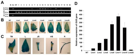 4.4. Quantitative Analysis of GUS Expression by qRT-PCR