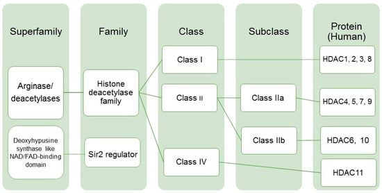 Histone deacetylase family/classes of proteins and expression in human bladder cancer tumors. Histone deacetylase family and respective classes and subclasses with human specific proteins (reviewed in []).
