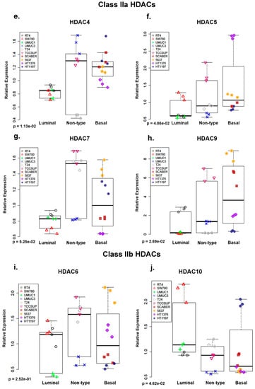 HDAC2, -3, -4, -7, and -9 are overexpressed in basal-squamous and non-type human BC cell lines. Boxplots depicting histone deacetylase (HDAC) expression in 10 bladder cancer (BC) cell lines (three replicates per cell line, with individual replicates depicted as one point). The cell lines are grouped based on the molecular characterization as previously described []. (a–d) Overall, class I HDAC expression increases in non-type and basal subtypes of human BC cell lines with significant differences in HDAC2 and -8 expression in human BC cell lines with non-type and basal subtypes compared to human BC cell lines with a luminal subtype. HDAC1 overexpression was observed only in human BC cell lines with a basal subtype compared to luminal and non-type molecular subtypes. HDAC3 overexpression is observed primarily in human BC cell lines with a non-type subtype. (e–h) Class IIa HDAC expression was consistently increased in human BC cell lines with non-type and basal molecular subtypes compared to luminal human BC cell lines. (i,j) Class IIb HDAC expression varied independent of molecular subtype in human BC cell lines.