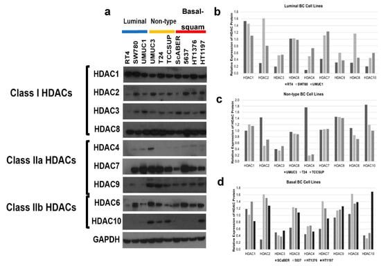 We next determined the degree of HDAC expression in human BC cell lines at the protein level in the same ten human BC cell lines (Figure 3). Our initial observations indicate HDAC1, HDAC2, HDAC3, HDAC6, HDAC7, and HDAC8 are expressed ubiquitously and independently of molecular subtype. Additionally, after densitometry analysis, we did not observe distinct trends by HDAC Class I and IIb for HDAC proteins. On the other hand, HDAC10 was expressed primarily in human BC cell lines with a non-type molecular subtype (Figure 3c. HDAC4 was expressed at the lowest levels of all examined enzymes, with highest expression levels exhibited in UMUC3. However, we do observe faint bands for HDAC4 in most human BC cell lines with a basal and luminal molecular subtype (Figure 3b,d). Interestingly, HDAC9 was the only HDAC expressed in human BC cell lines with a non-type or basal molecular subtype (Figure 3c,d). We were unable to identify a suitable antibody for HDAC5. A limitation of our analysis of HDAC proteins in human BC cell lines was using whole cell lysates. It may be advantageous to re-analyze HDAC proteins in cytoplasmic and nuclear extracts isolated from human BC cell lines.